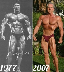 На фото – Фрэнк Зейн (кто в теме – тот знает, кто это) – один из самых знаменитых бодибилдеров «золотой эры», трехкратный обладатель титула «Мистер Олимпия». Будучи маленьким (рост – всего 175 см) и обладая щуплым телосложением, он сумел упорным трудом стать одним из лучших культуристов всех времен и народов.